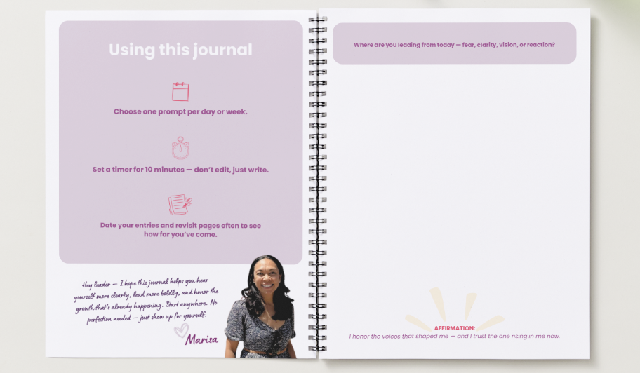 A leadership journal is a power tool for tuning in. It’s a private space for gathering your thoughts, challenging and honoring your growth, and centering yourself in clarity. Whether you're navigating a new role, managing a team, or taking your vision to the next left, journaling can help you process, plan, and own your leadership story.